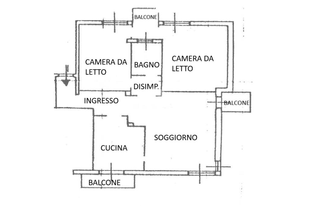 L'ingresso si apre su un disimpegno funzionale che separa gli ambienti. La zona giorno è composta da un ampio soggiorno luminoso e da una cucina abitabile; entrambi i locali godono di due balconi privati.